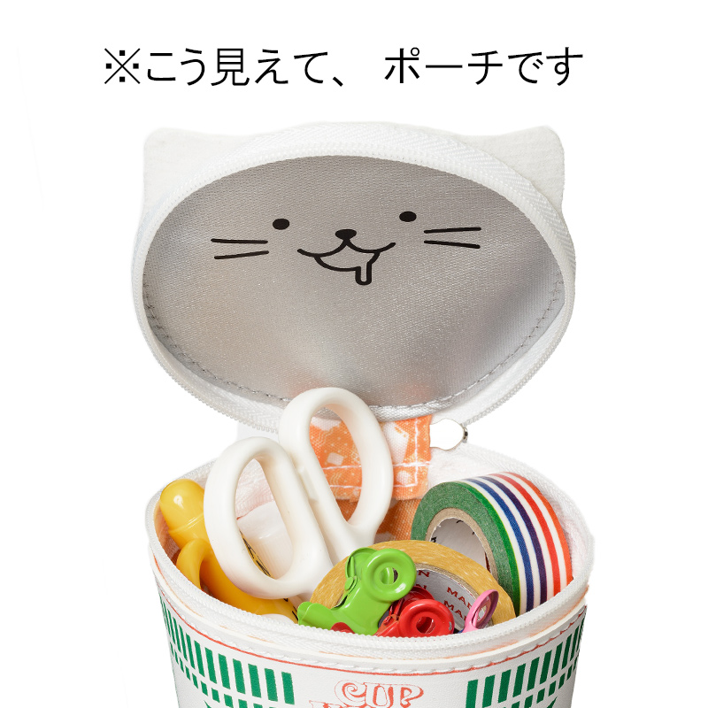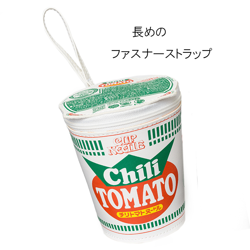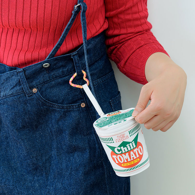 本誌限定アイテムは、チリトマトヌードルの形&デザインそのままのほぼ実物大サイズのポーチ! 前から見ても、後ろから見ても、上から見ても、下から見ても、びっくりするほどそっくりな仕上がり。フタは今年リニューアルされた新形状“Wタブ”仕様。シルバーのフタの裏にはネコをプリントし、話題の“ネコ耳”まで再現しました。裏地には、本誌オリジナルデザインの麺&具材柄をプリント。ファスナートップがストラップになっているのもポイント。そこにあるだけでワクワクするポーチを、ぜひ手に入れて!
