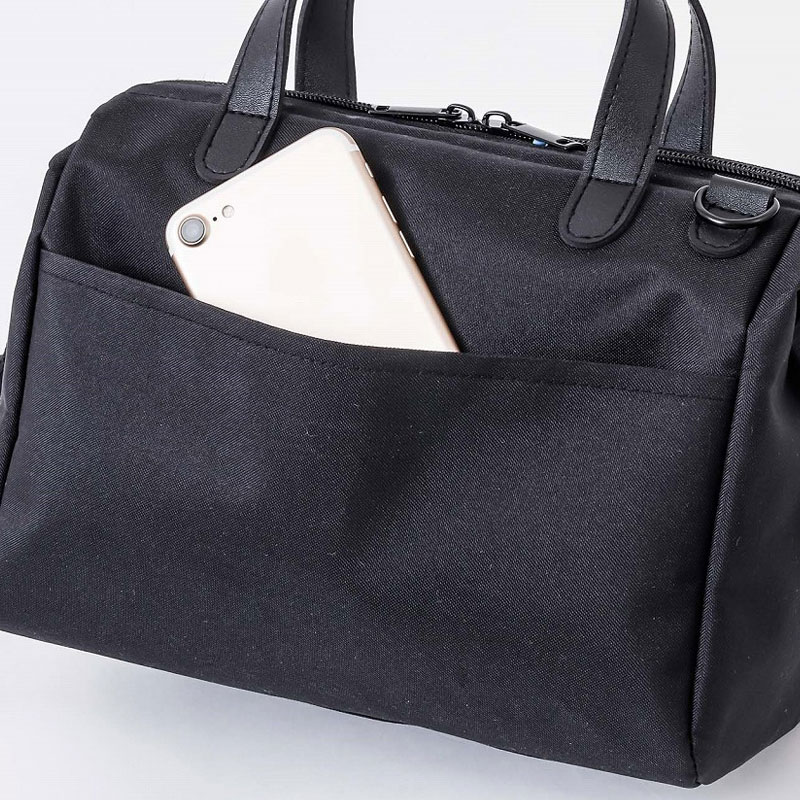 スマホや除菌スプレーなど、小物をすぐに取り出せる外ポケットを両面に。前面はファスナーつきだから、荷物を落としにくくて安心です。