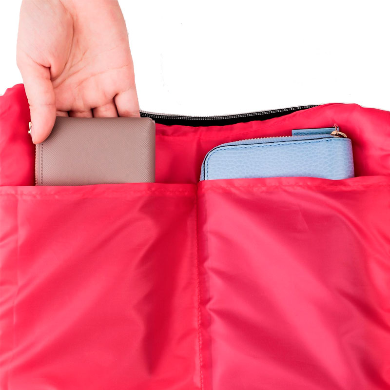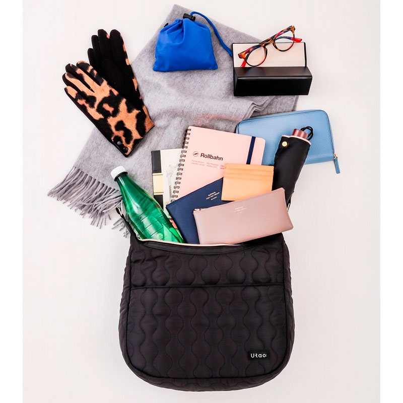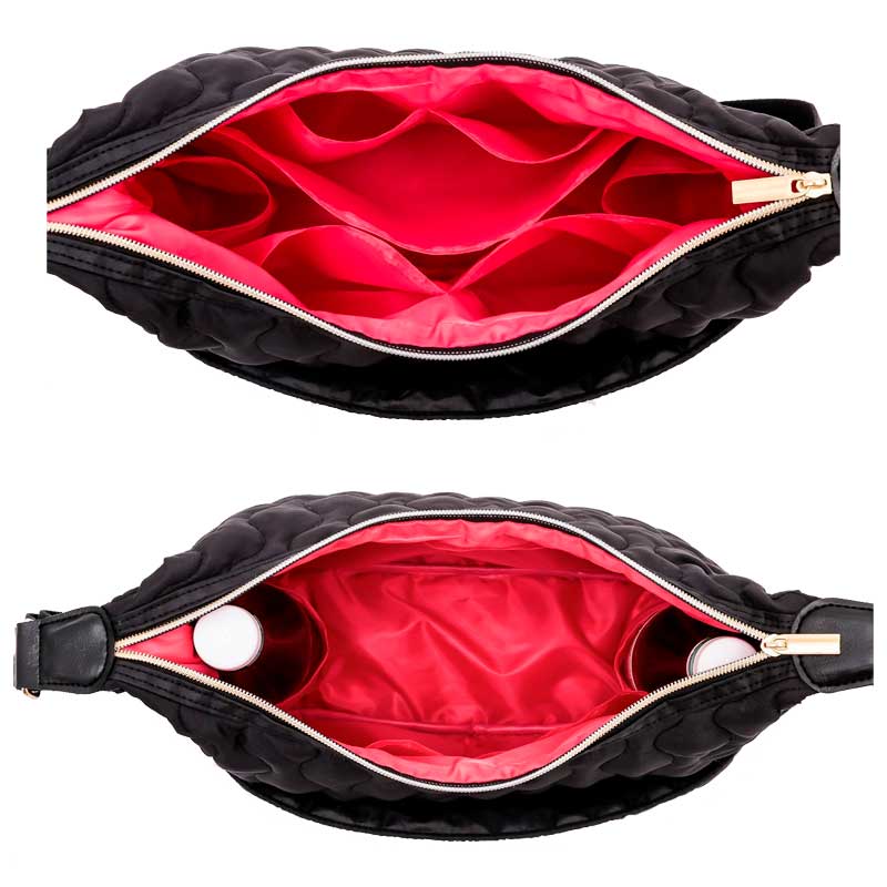 スタイリスト飯田聡子さんの監修のもとおしゃれで機能面抜群なキルティングバッグを作成しました。撥水、軽量、9個の多ポケット、体に沿う三日月型、2wayで使えるなどポイントがたくさんあります。メイン収納の裏地は赤ピンクで中身が見やすいように工夫しました。