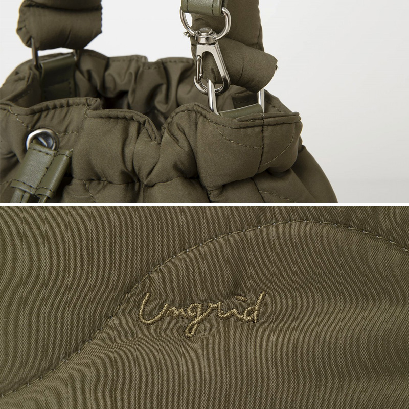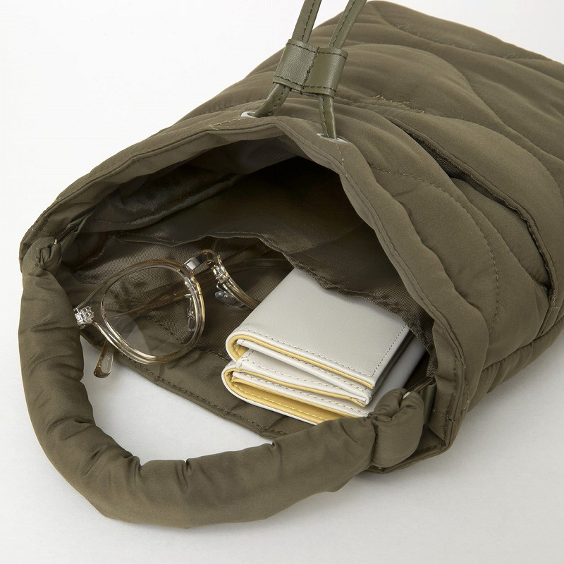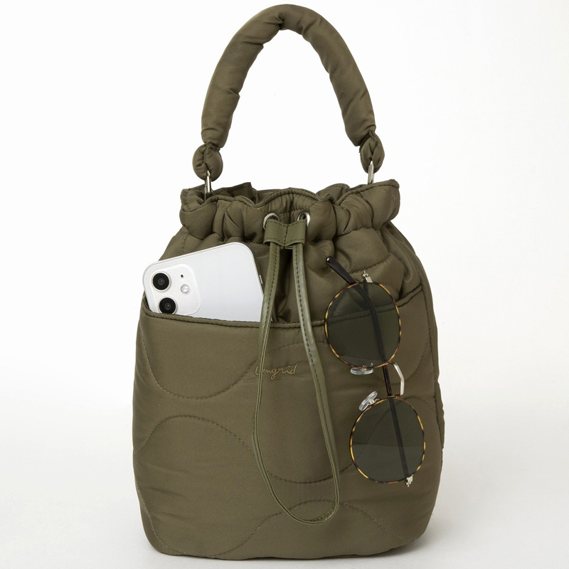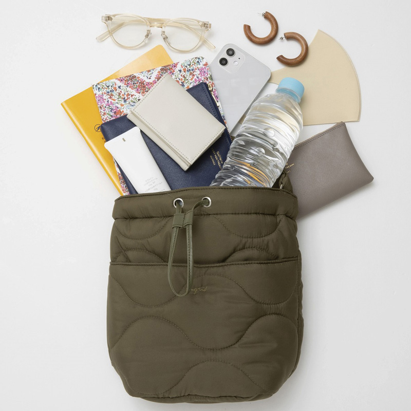 大人っぽいカーキの巾着型バッグは、秋冬のおしゃれを格上げしてくれること間違いなし。
