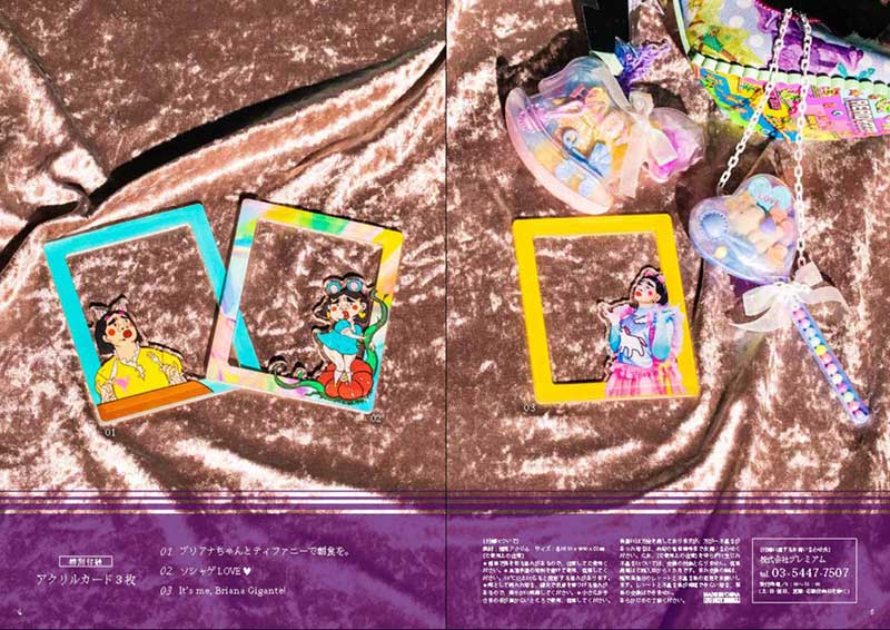 特別付録は、アクリルカード3枚(サイズ H110×W90×D3mm)。ブリアナちゃん自身が描いたイラスト2枚と、実写1枚です。フレーム内がくり抜いてあるので、撮影時の写り込みがなくきれいに撮影できます。好きな場所やモノを背景に、ブリアナちゃんと一緒に写真を撮りましょう!