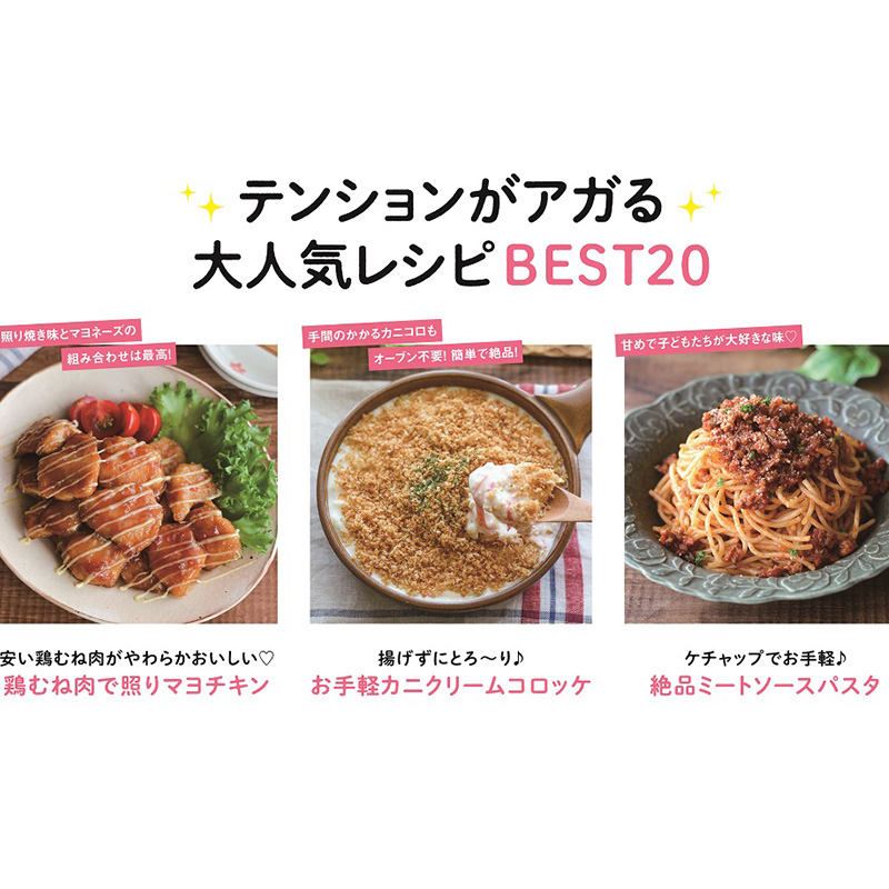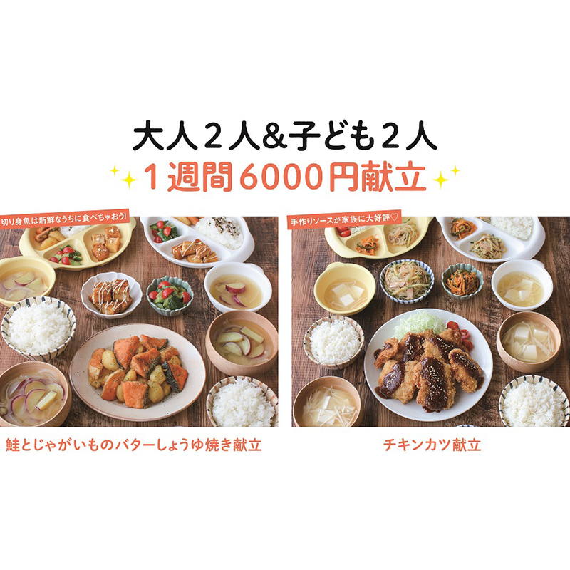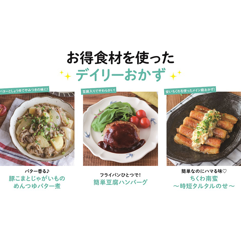 お得食材を使ったボリューム満点おかずから、4人家族1週間6000円献立まで、時短になるアイデアや、おいしくなるひと手間を豊富に紹介しています。