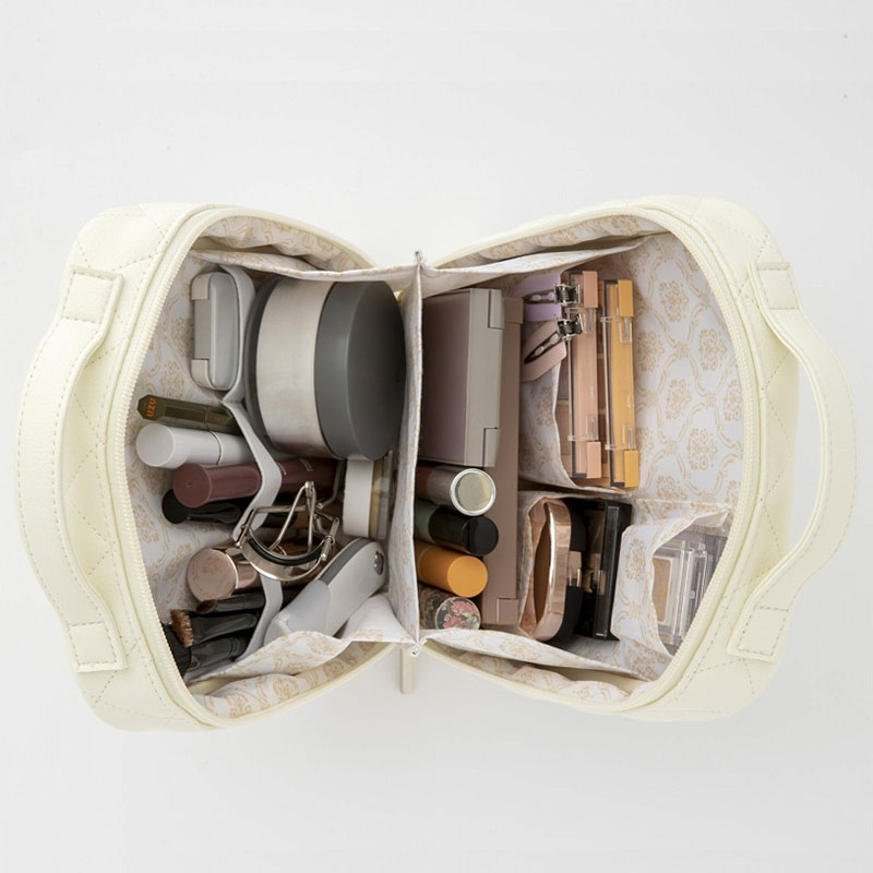 ○メイン収納の真ん中には仕切りがあるので、コスメを立てて収納できる