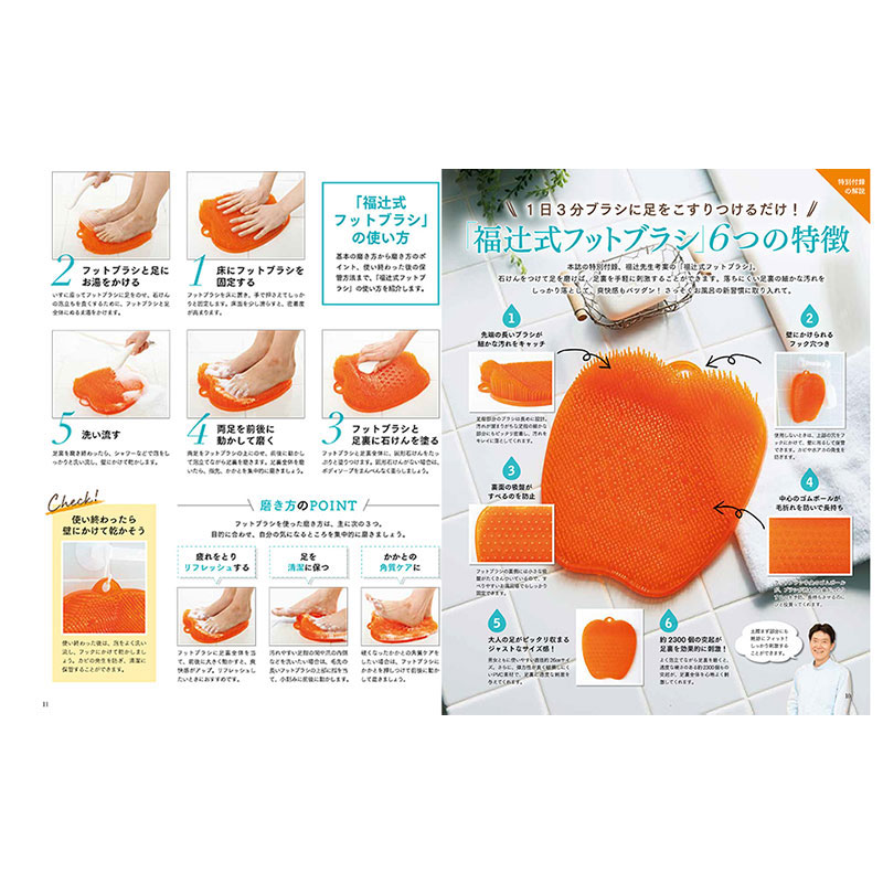 アスカ鍼灸治療院院長・福辻鋭記先生監修の「足裏磨き」。足の裏には約40の反射区があり、「人体の縮図」と言われています。ここを刺激すると全身によい効果があり、とりわけ全身の血行促進に効果があり、足裏は「第二の心臓」と言われるほどです。本誌には、約2300個もの突起がついた「足裏ブラシ」がついています。お風呂で体を洗いながら気軽にできるマッサージ。冬の寒い日も足裏からぽかぽかと温まりましょう!