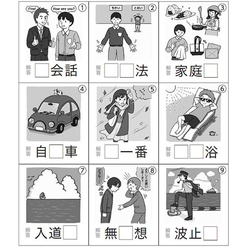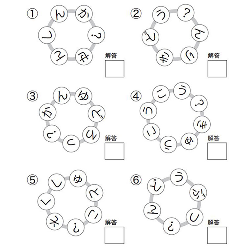 クロスワードパズル、まちがい探し、さいころ計算、迷路、ナンバープレース、点つなぎ、100マス計算、漢字読み書き、全部でいくら?、イラスト漢字など