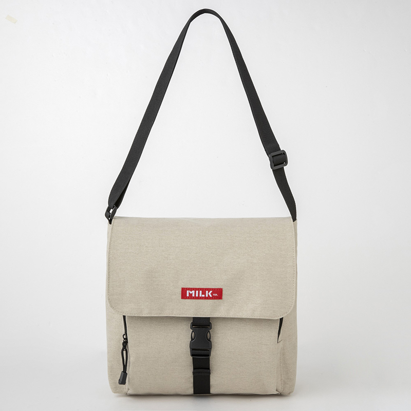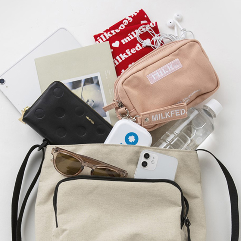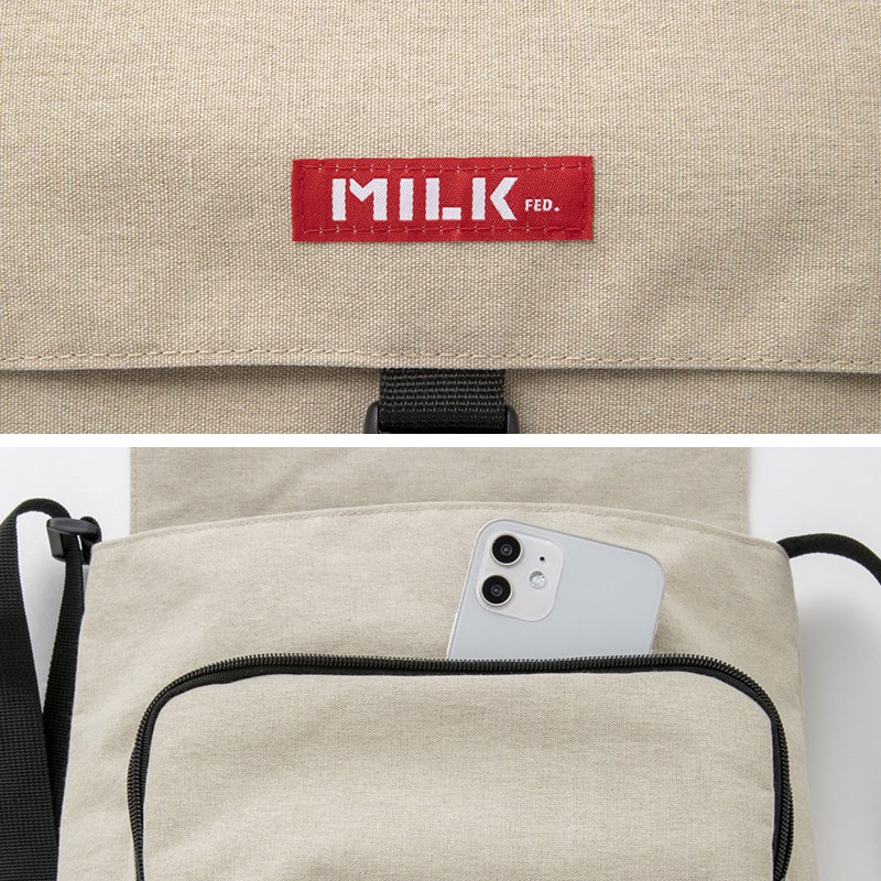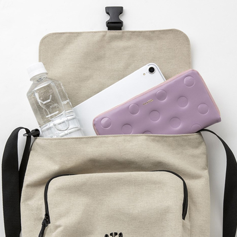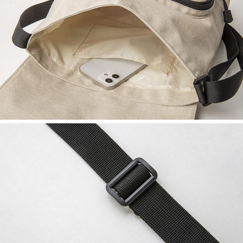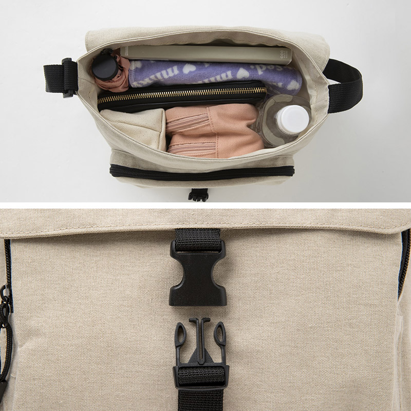 フラップ付きショルダーバッグは、500mLペットボトル、長財布、折りたたみ傘なども収納でき、街歩きなどにぴったり。また、便利なのがフラップの後ろについたジップポケット。スマートフォンなど、よく使うものを仕分けられます。ベージュカラーが、キャンバス風素材のやわらかい風合いを引き立てる、春にぴったりのアイテム。