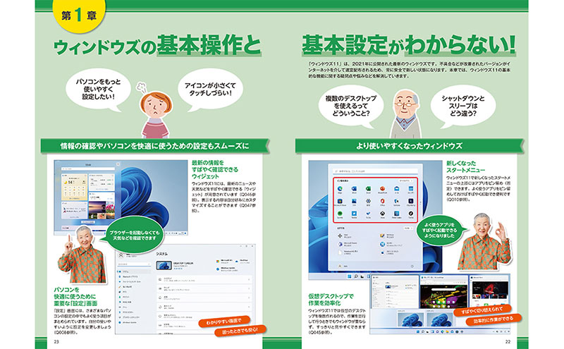ついに登場したWindows 11。本誌では、Windows 11やインターネットに関する疑問や不満の解決法のほか、知っていると便利な技、快適設定などをQ&A形式でやさしく丁寧に解説します。マウスやキーボードの超基本操作をはじめ、ウェブの閲覧方法、メール、ワード、エクセルなどの各種アプリの使い方はもちろん、パソコンの調子が悪い時の対処法や、個人情報を守るセキュリティ対策まで、幅広いジャンルを取り上げました。パソコンで困ったら、まず開いてみてください。