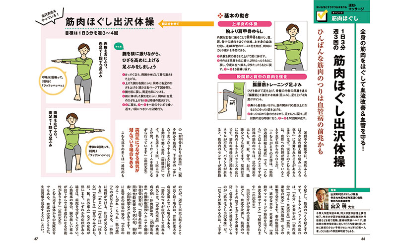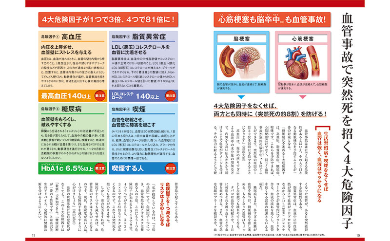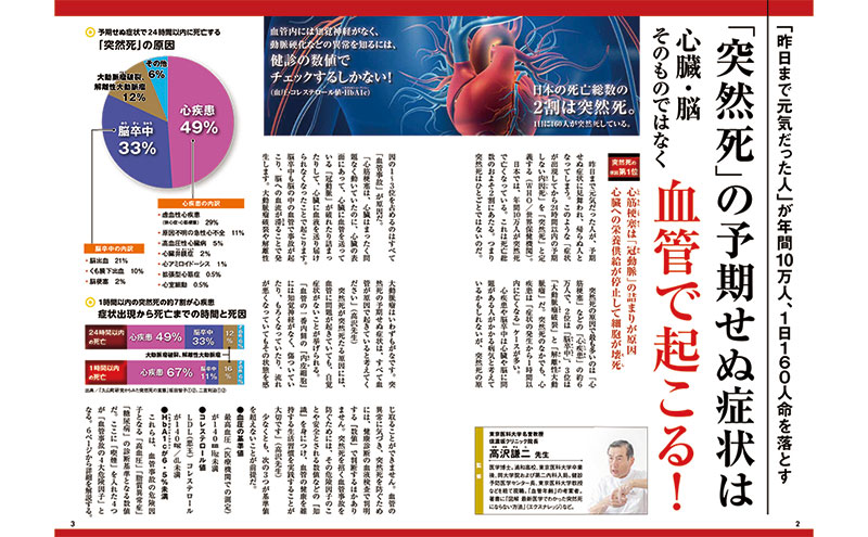 症状が出てから24時間以内に死亡する「突然死」。成人の突然死の原因1位は重篤な不整脈によるものですが、血管を強くして血液をサラサラにすることで、高血圧や糖尿病、動脈硬化、ストレスなどによる血管の傷みが修復され、突然死のリスクを下げることができます。本誌では、「血管を強くする方法」と「血液をサラサラにする方法」を、「食事」「運動」「生活習慣」の3テーマごとに解説します。