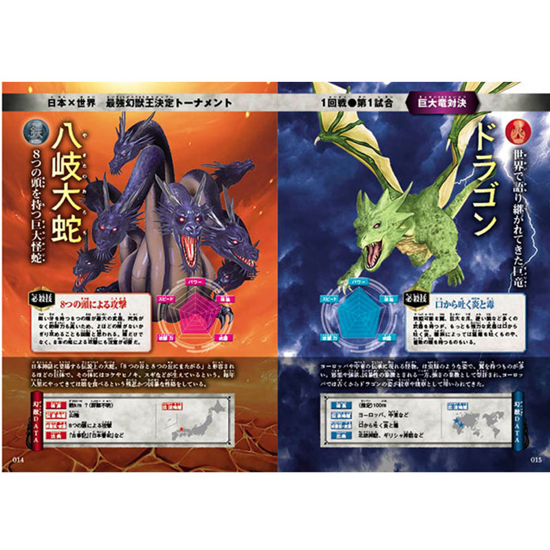 大百足、土蜘蛛など日本の幻獣VSドラゴン、サラマンダーなど海外の幻獣がトーナメント方式で迫力のバトルを繰り広げます。各コラムでは幻獣たちの特徴と武器、部門別の幻獣ランキングなどさまざまに楽しめる一冊になっています。