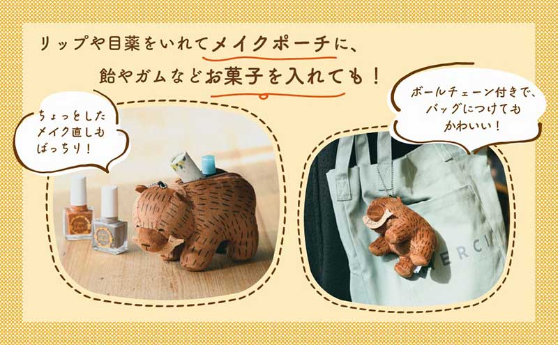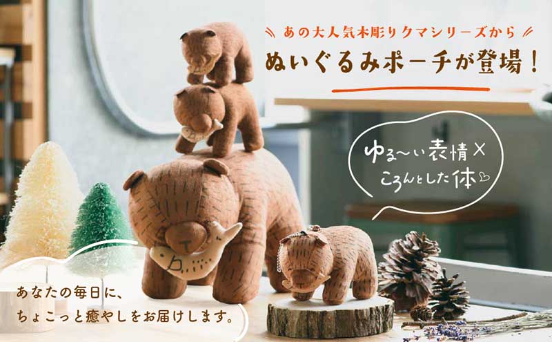 SNSで話題になった木彫りクマのぬいぐるみが、そのままのフォルムでポーチになって登場。