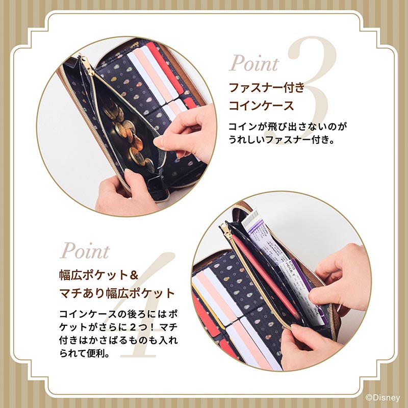 コインが飛び出さないファスナー付き。裏地が黒で汚れが目立たないのもうれしいポイント。