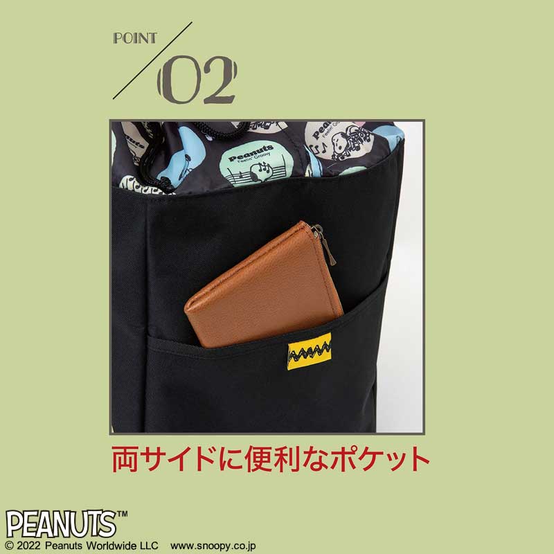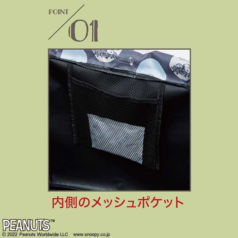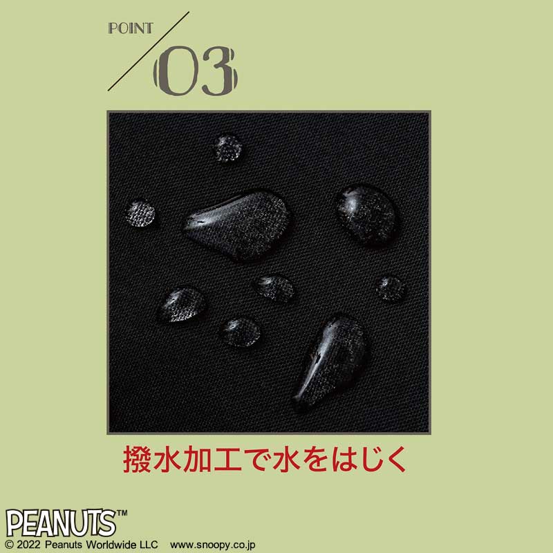 前面はスヌーピーとウッドストックの大きなイラスト入りで、トレンドカラーのピスタチオグリーンが差し色になってお洒落な印象です。