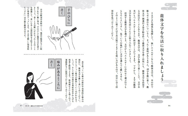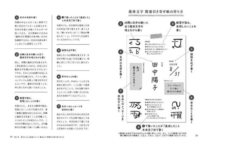 龍体文字――日本神話、神代から伝わる願いをかなえる不思議なパワーを持つ文字です。本書には、龍体文字を効果的に活用するための「開運引き寄せ帖」が別冊(本体から取り外し可能)として付属し、そのノウハウも解説します。自分の名前の周りに「願望の実現」や「悩み克服」などの効力を持つ龍体文字を書き、文字が持つエネルギーで自分を強める「結界」を張るイメージです。特典として「願いがかなう龍体文字シール」も付いてきます。
