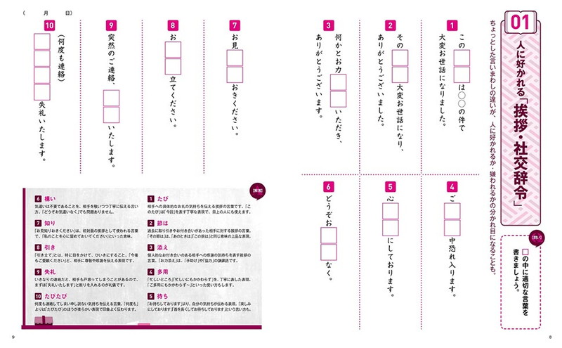 日常で使える言葉や、知的に思われる表現、正しい敬語など、書き込みドリル形式で、考えて書いて語彙力がアップする一冊です。