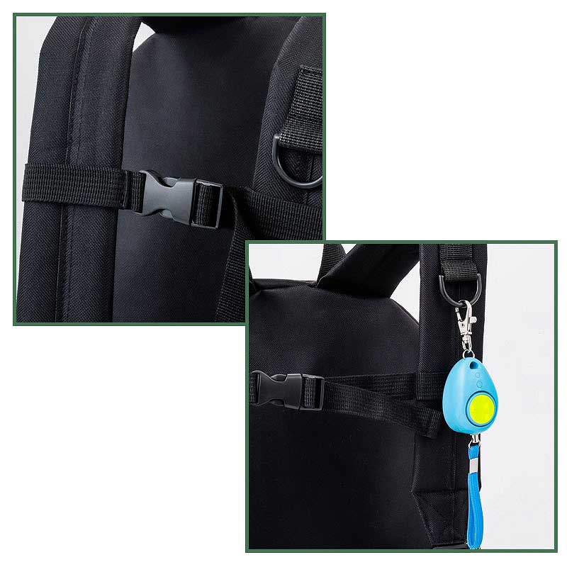キッズリュックには欠かせない防犯ブザー用Dカンも配置。大人はここに携帯ポーチを付けると、リュックを背負ったまま小物を取り出せて便利。