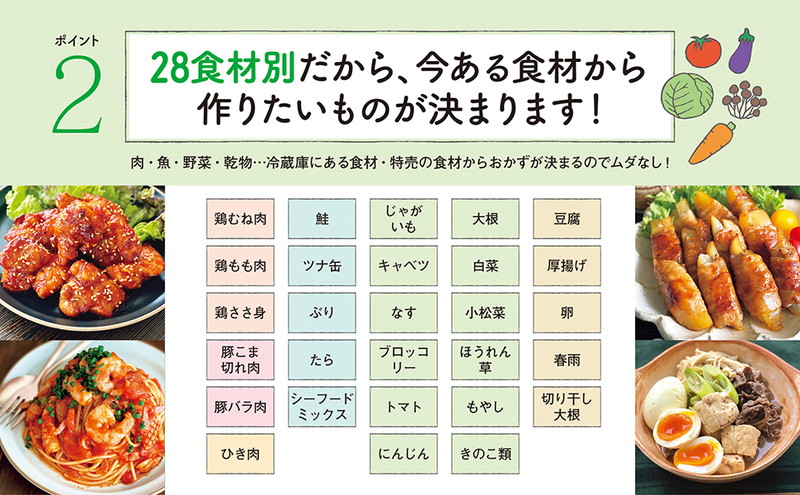 食材別に分かりやすく掲載されており、また食材1~2品でできるものも多いので、今ある食材でパパッと作れます。