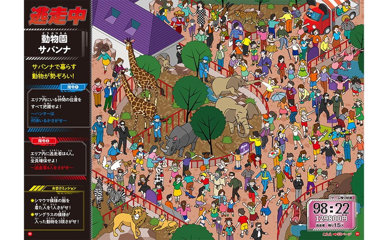 シリーズ第2弾の今作は、読者が「ハンター」側になって、「逃走者」を見つけて捕まえるゲーム感覚の「絵さがし本」です。