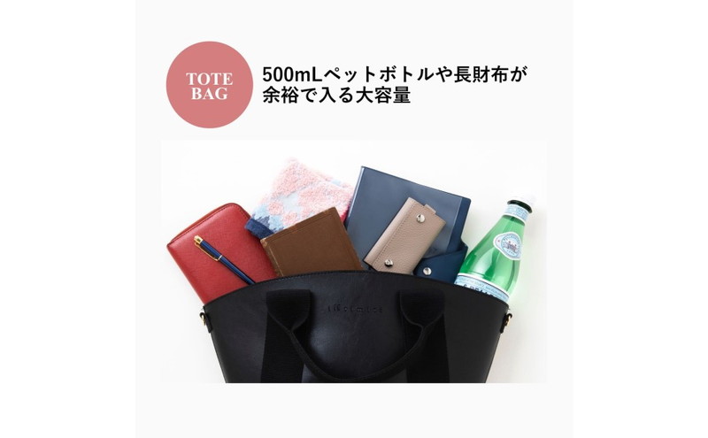 トートはお出かけにぴったりな大容量。500mLペットボトルや長財布を入れてもまだまだ余裕なサイズ。