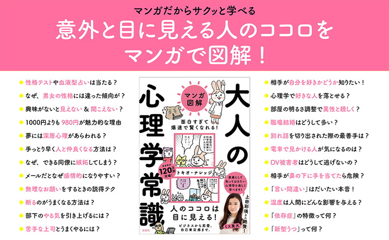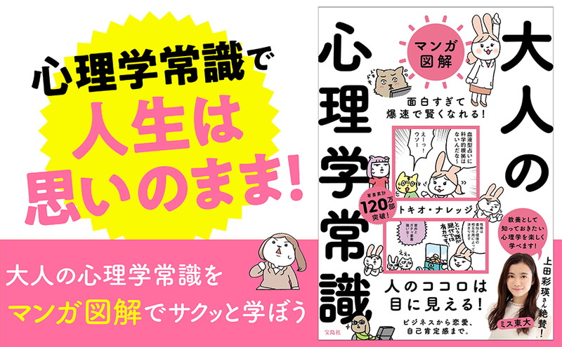 著書累計120万部突破! トキオ・ナレッジの最新マンガ図解本です。大ヒットした『大人の心理学常識』をマンガでさらにわかりやすく解説! 「性格はどうやって決まるの?」「人は見た目が9割ってホント?」「人の心をつかむ! 話し方のポイント」「苦手な上司とうまくやるには?」「プレッシャーに負けないようにするには?」など人間心理から、人間関係を良くする心理テクニックまで。