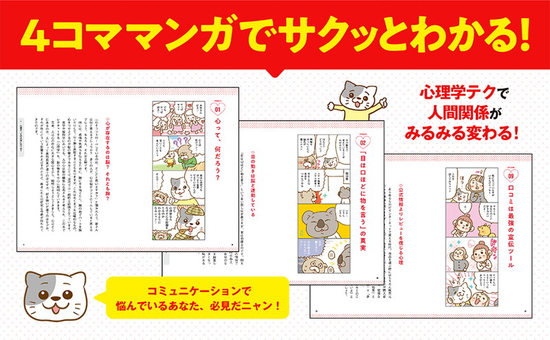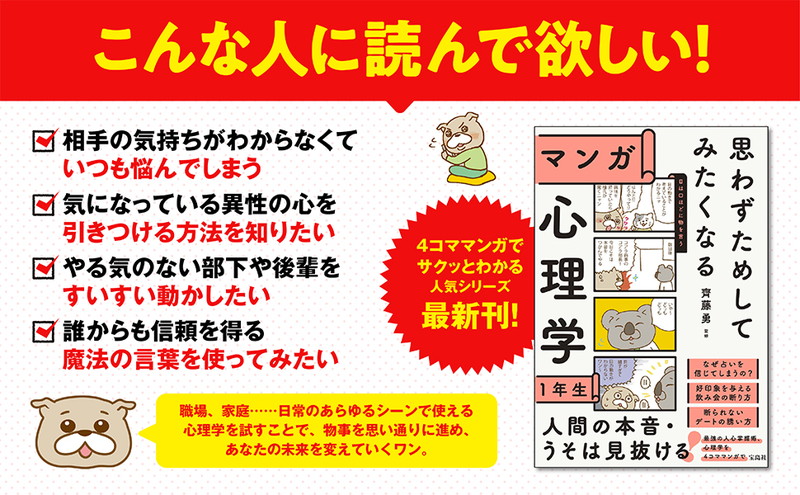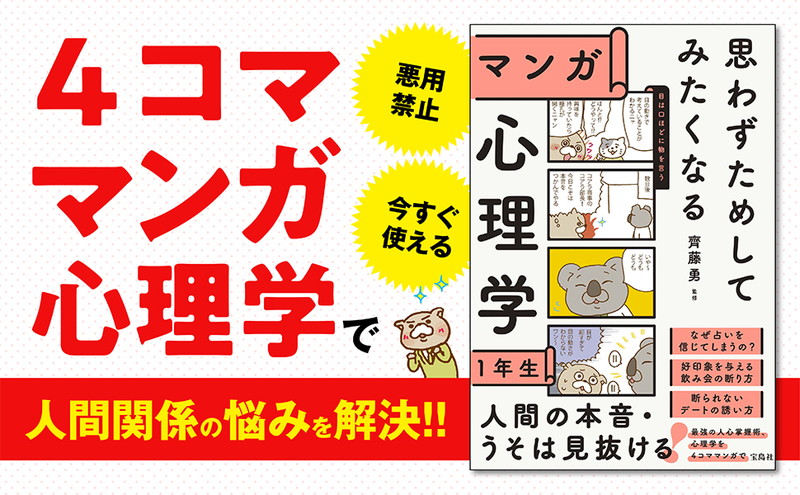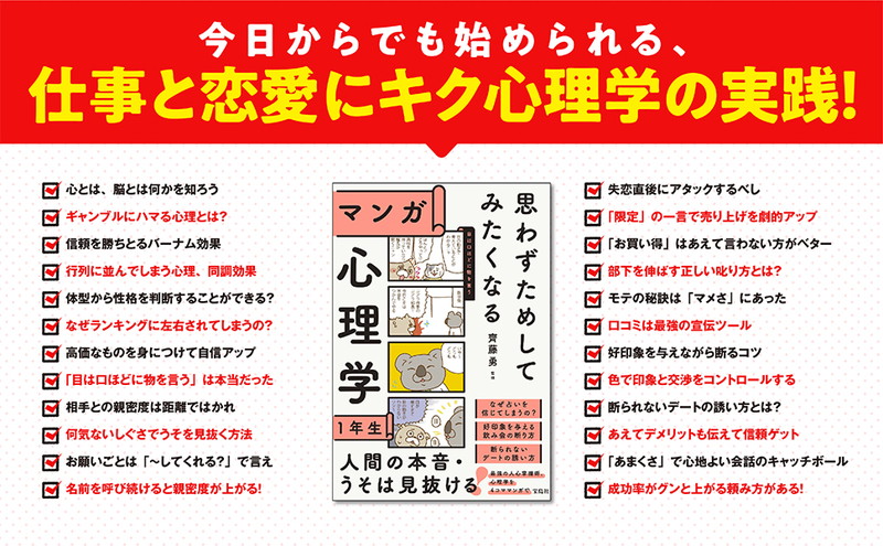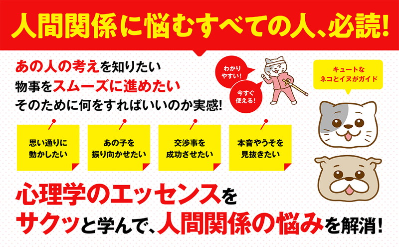 なぜあの人はこんな言動をするの? どうして占いを信じてしまうの? どうしてみんな思い通りに動いてくれないの? など人間心理の基本から、人の本音やうそを見抜く方法、無理なお願いを頼む説得テク、好印象を残す断り方、会議を有利に進める心理作戦、好きな人を落とせる裏ワザなど、仕事や恋愛に役立つさまざまな心理学の理論を紹介します。
