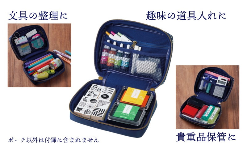 大きめのペンケースとしてお気に入りの文具を整理したり、はんこやスタンプ台など、趣味の道具入れにしたり、印鑑や通帳などの貴重品入れにしたり。
