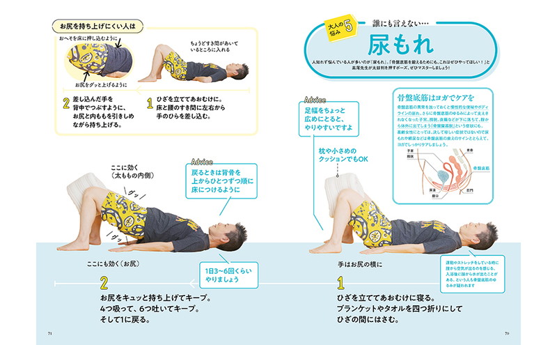 骨盤底筋の機能低下による尿もれや、体の「なんとなく不調」にも効くやさしいポーズ、毎日続く体の動かし方を紹介します。