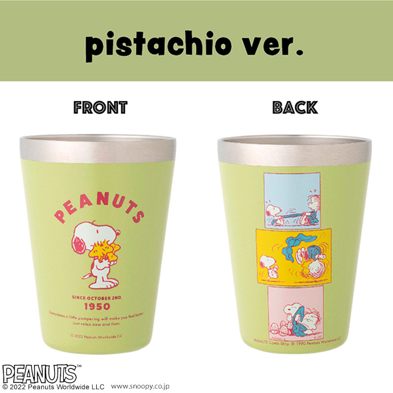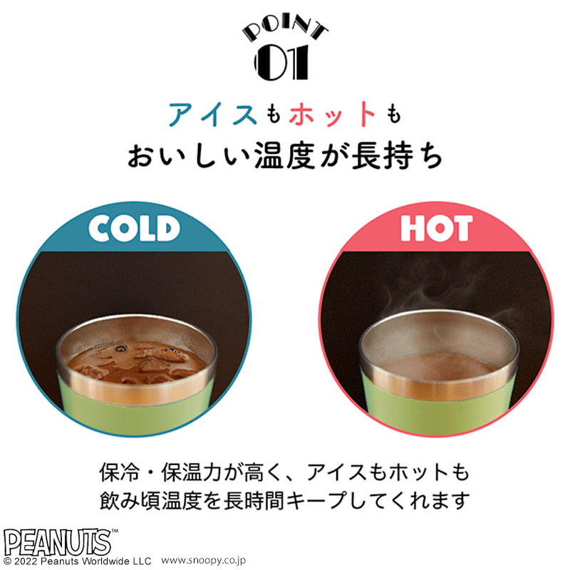 もちろんタンブラーに直接飲み物を入れて使用することも可能で、COLD & HOT兼用。背面にはPEANUTSの原作コミックをオン。