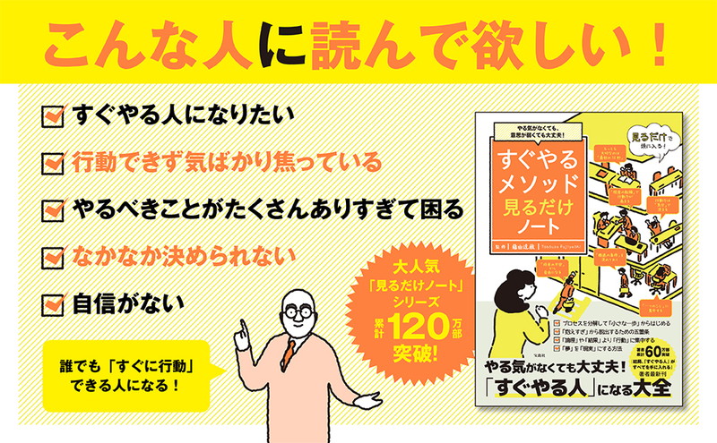 累計150万部突破の人気シリーズ「見るだけノート」の最新刊は「すぐやるメソッド」がテーマです。「明日でいいや」「めんどくさい……」といった口癖は、科学的に改善することができます。やる気に左右されないマインドの作り方や、余裕を生み出す時間管理方法など、一生使えるメソッドをイラストと共に解説していきます。誰しも抱える「後回しグセ」を改善し、様々なシーンで生産性を高めるスキルが取得できる一冊です。