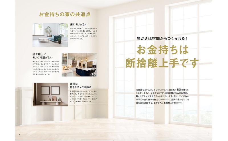 お金持ち生活に近づくためのモノと付き合い方、空間の整え方、お金についての考え方を提案。