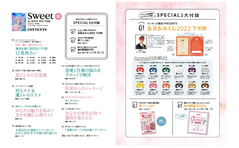 ゲッターズ飯田先生監修の「金言おみくじカード」、水晶玉子先生の「寿ゾーン占い」、「絶対開運BOOK」と豪華付録にも注目。