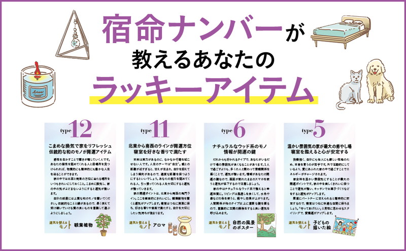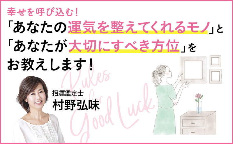 身近なモノの選び方、置き方にこそ運気を整えるポイントが隠れています。『突然ですが占ってもいいですか?』(フジテレビ系)などテレビでも話題沸騰の招運鑑定士・村野弘味先生が、最強のパワースポットといわれるご自宅を例に、最強の開運アイテムや置く方位など、幸せを招くちょっとしたコツを教えてくれました! あなたの星に合ったラッキーアイテムや、行くとハッピーになれる方角もたっぷりご紹介します。