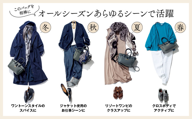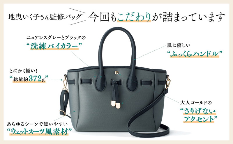 シリーズ累計47万部超! “おしゃれな人ほど少ない服で生きている”というメッセージを込めた書籍『服を買うなら、捨てなさい』(宝島社)の著者である人気スタイリスト地曳いく子さんによる“使える”大人バッグが今年も登場! 今年のお題は「持っていてストレスのない・軽い・いいものを知る大人がガンガン使える」魔法のようなネオプレン調バッグ。