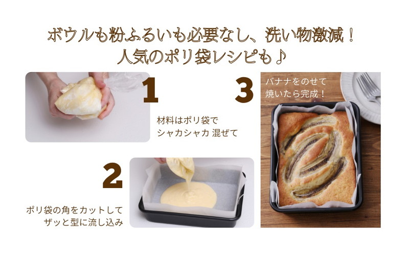 レシピは、ポリ袋の中で材料を振るだけでできあがる手軽なケーキもご紹介。特別なお菓子の道具がなくても大丈夫!