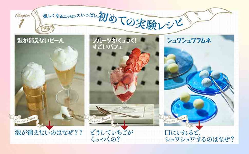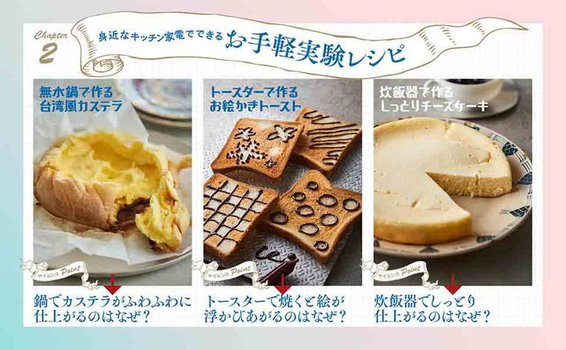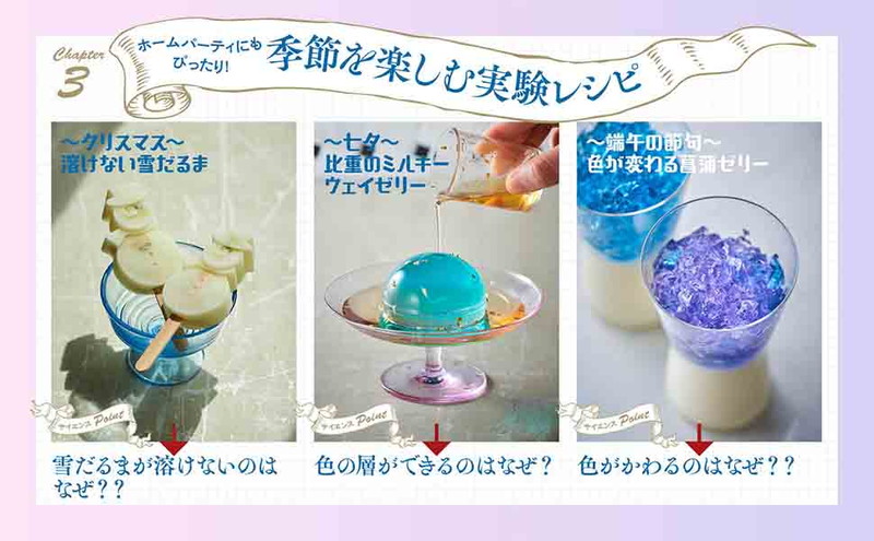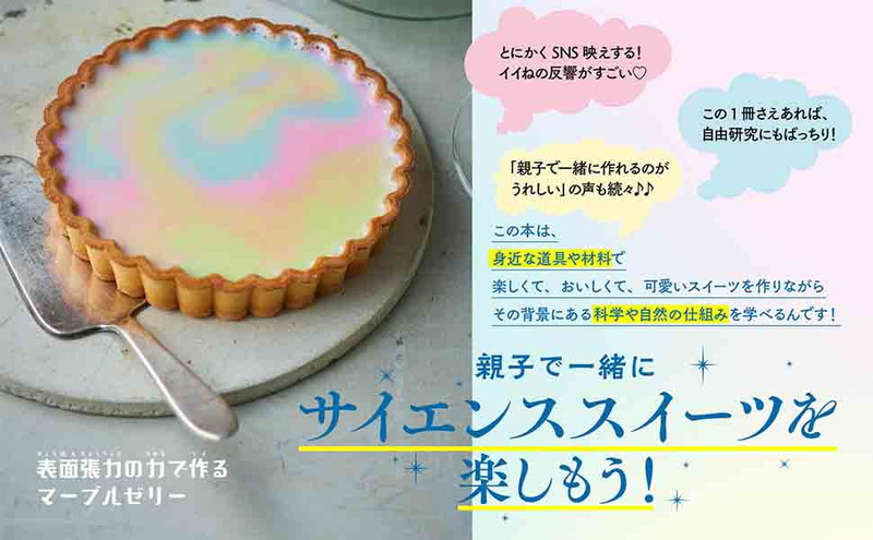 おうちにある身近なものでできる、美しく・おいしい・楽しい「最新サイエンススイーツ」を紹介。「どうしてそうなるのか」を科学的視点で説明し、楽しく理系脳を育みます。はじめて料理をする子どもにもぴったりな、炊飯器や冷凍庫でできる楽ちんレシピも多く掲載。「色が変わる菖蒲ゼリー」「イースターの卵白ふわふわメレンゲ」など、一年の行事にちなんだ実験レシピも大充実。一年を通じて家族で楽しめます。
