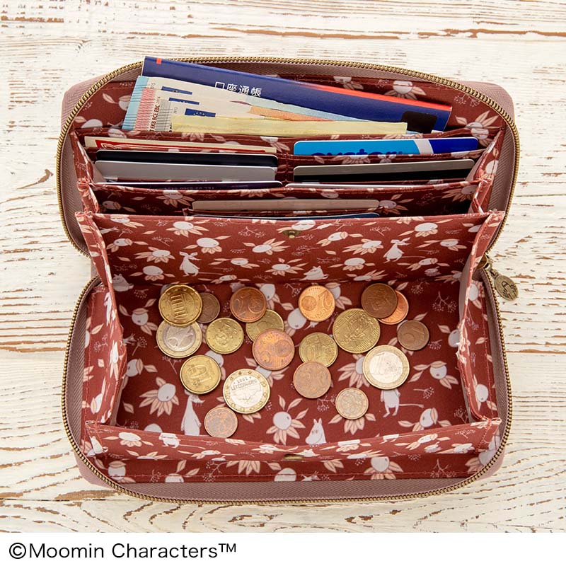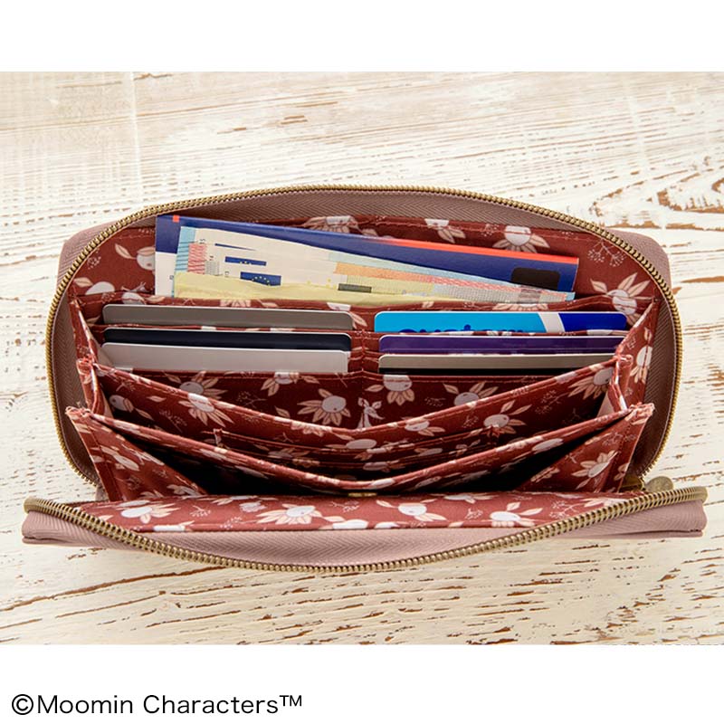 お財布を開くたびに見える裏地は、それぞれ色違いの、ムーミンと仲間たちの華やかな総柄デザイン。