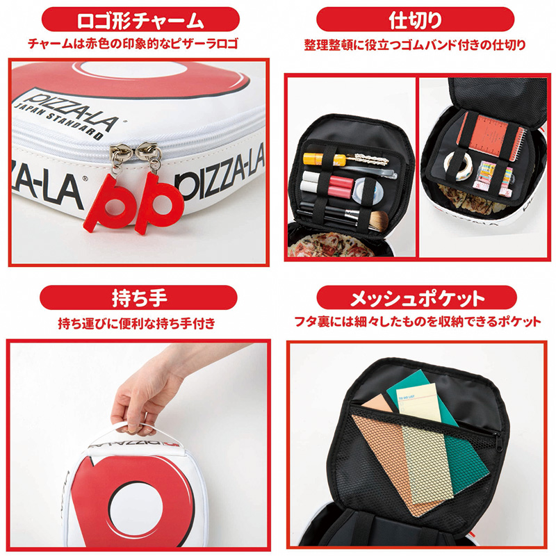 特別アイテムはマルチに使える多機能ポーチ。本物のピザ箱そっくりなポーチを開くと、底にはリアルなピザのプリントが。