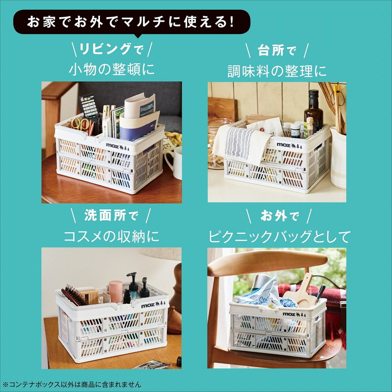 コンテナは持ち運びやすいバスケット型。荷物を入れた状態での持ち運びもラクラク。アウトドアでも活躍してくれそう。