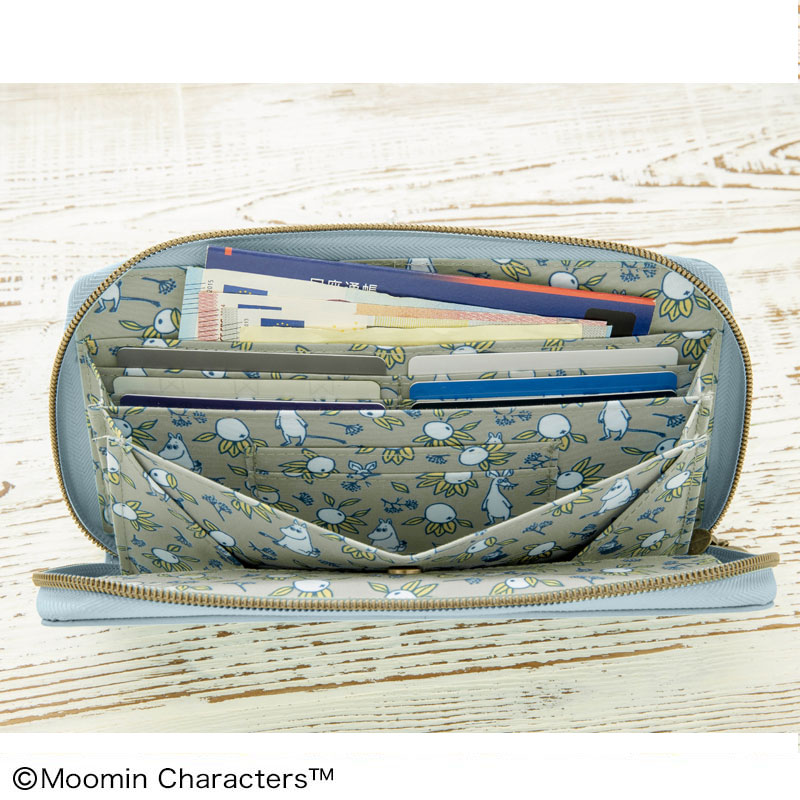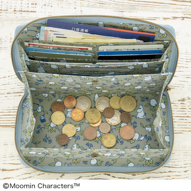 お財布を開くたびに見える裏地は、それぞれ色違いの、ムーミンと仲間たちの華やかな総柄デザイン。