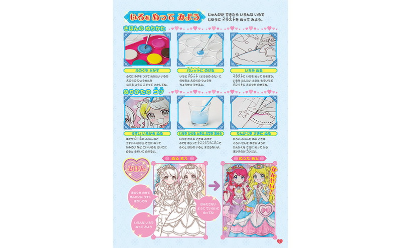 はじめるのもお片付けも楽ちんな水でといて使える固形絵の具21色がセットされたパレットと筆が付録についたぬりえブックです。