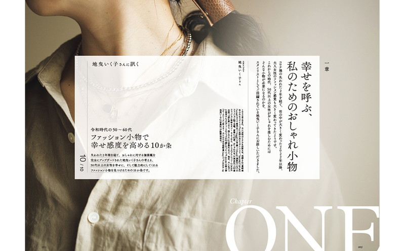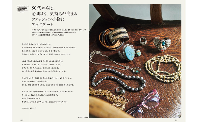巻頭では、人気スタイリスト地曳いく子さんに大人の小物の選び方を伺っています。