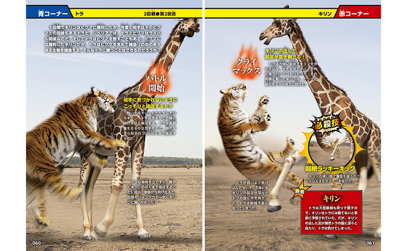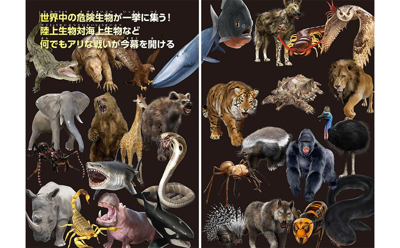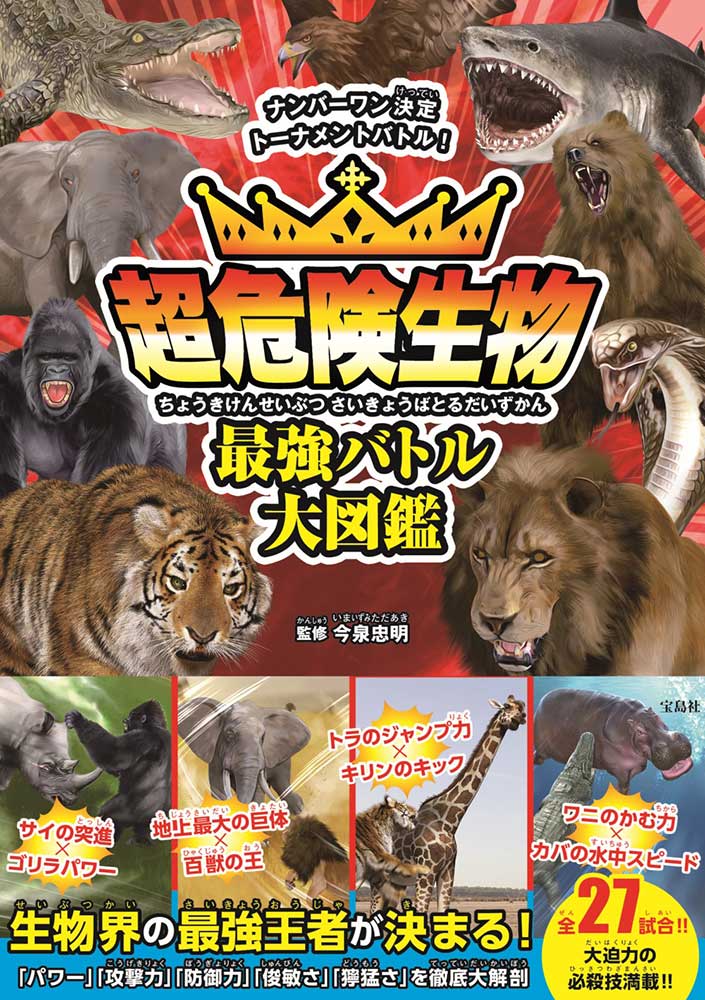 「最強バトル図鑑」シリーズの“危険生物”のバトルがさらにパワーアップして登場! ライオンやアフリカゾウなど強い動物たちと、昆虫や爬虫類、水中の生物などさまざまなジャンルで最強の生物たちが異種格闘技の大バトルを展開! 果たして超危険生物の頂点に立つのは誰だ――!?