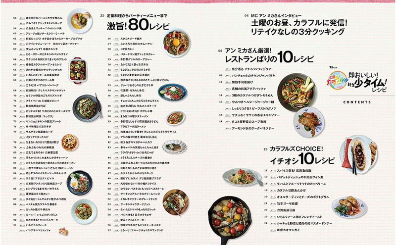 番組MCのアンミカさんをはじめ、カラフルズメンバーのクリス松村さん、ryuchellさん、よしあきさん、タナカガさん(パパラピーズ)、ミチさんのおすすめのレシピをご紹介。レシピ監修は料理研究家の高橋善郎さんで、料理初心者でも簡単においしくできて、ササッと作れるさまざまな工夫がギュッと詰まった一冊です。