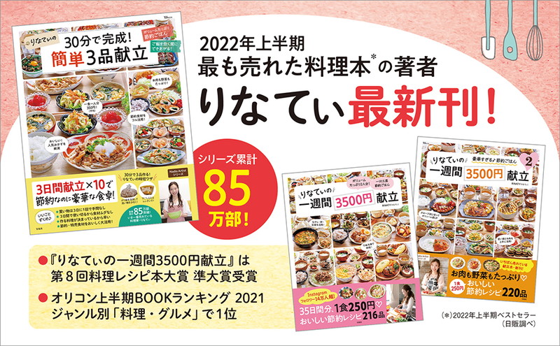 3冊目となる本書は、「30分で3品できる簡単献立」。今年3月に結婚が発表され、仕事と家庭生活の両立でますます多忙となったりなてぃ。