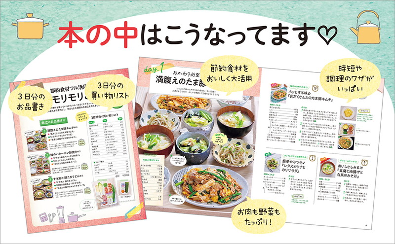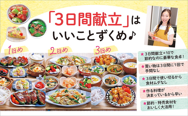 3日間ですぐに終わるので達成感もあり、急な用事ができても食材を管理しやすく、よりリアルな生活に沿った献立本となっています。