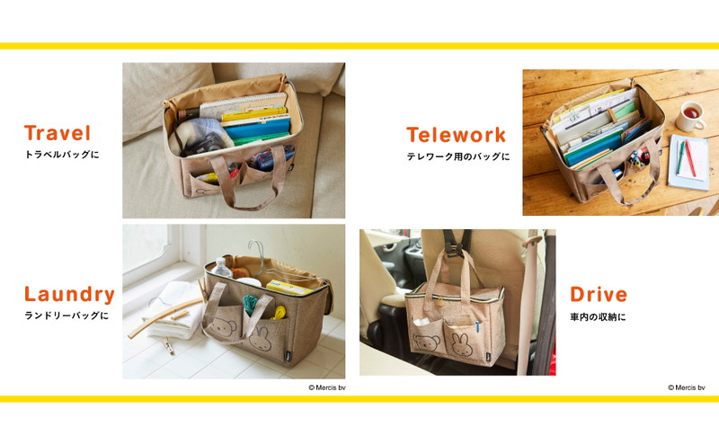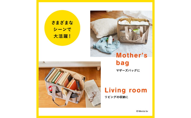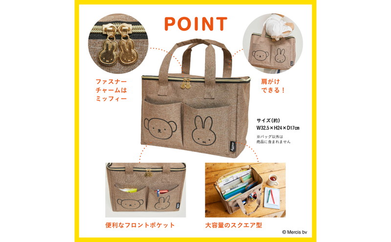 高級感のある生地に、ミッフィーとボリスがプリントされたピクニックバッグ。生地色は、インテリアにもファッションにもなじむ、おしゃれで上品なブラウンカラー。シンプルなデザイン&大容量サイズなので、お出かけにはもちろん、お部屋の収納バッグやマザーズバッグとしても大活躍します。