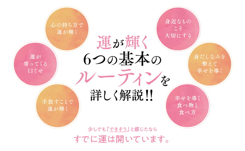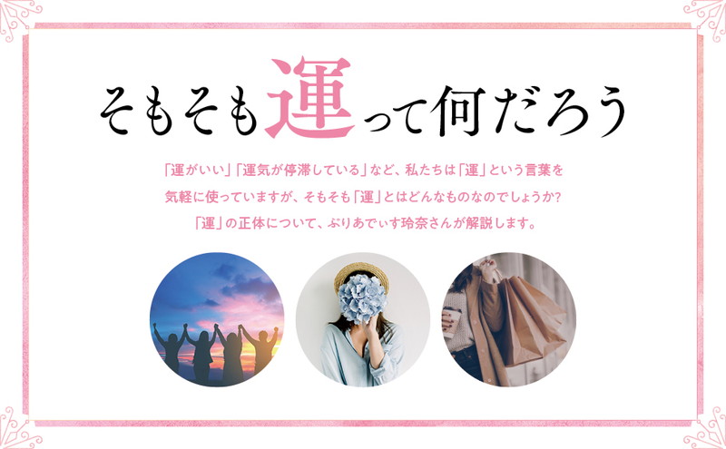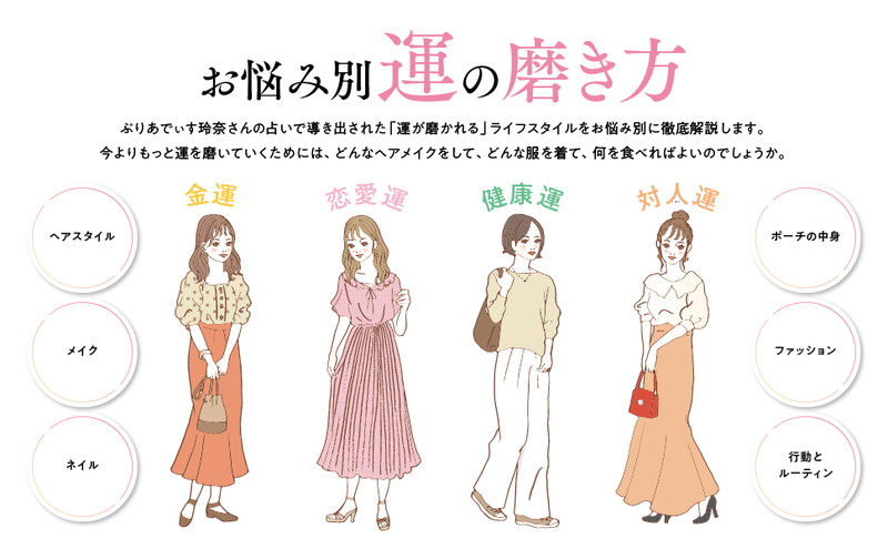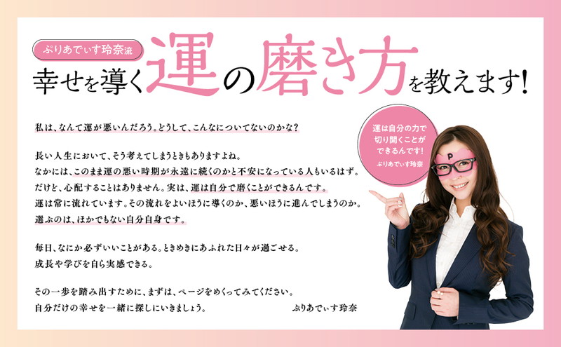 さまざまな開運方法がある中、誰もが取り入れやすく、変化がわかりやすい、ぷりあでぃす玲奈さん得意の『見た目を変える』方法をメインに開運メイク、ヘア、ネイル、開運レシピ、運を引き寄せる考え方やルーティンをたっぷりとご紹介。