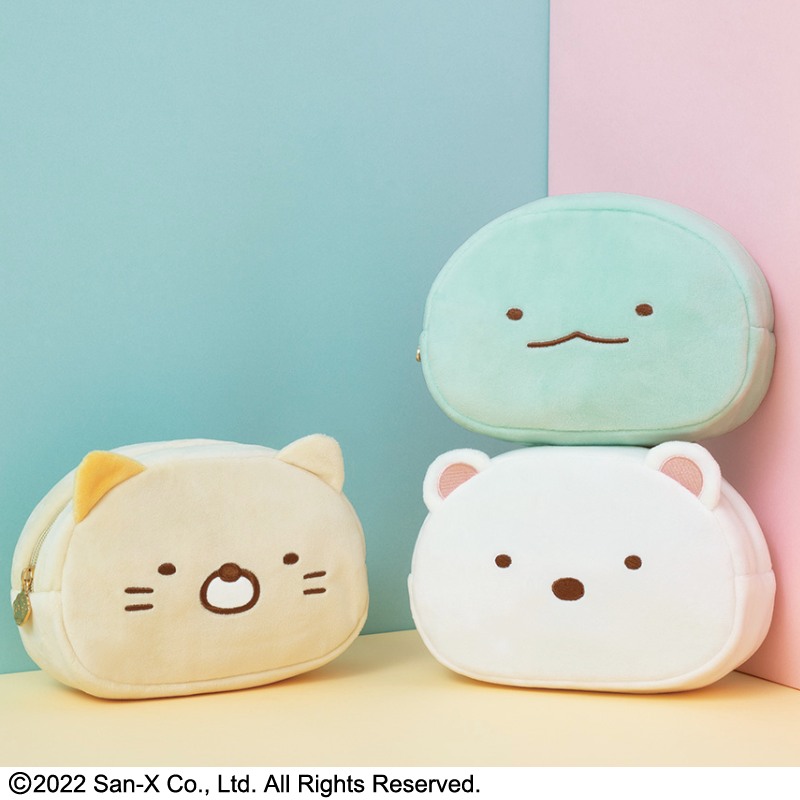 「すみっコぐらし」の人気キャラクターが、ふわふわ素材のポーチになって登場。