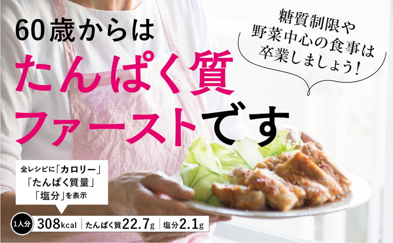 若いころと同じような食事をしていては不足しがちな「たんぱく質」をはじめとするシニアに必須の栄養をとるために、ご自身も60代に入ってなお元気に活躍する料理家・岩﨑啓子さんが、同年代の方が手軽に作れておいしいレシピをたっぷり考えてくれました。