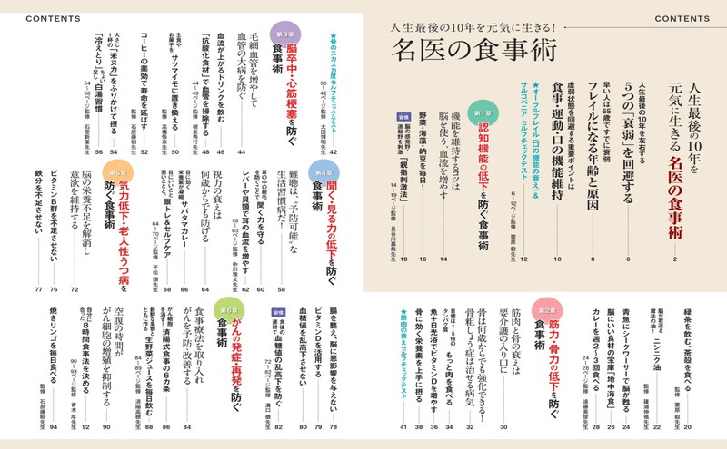 「脳・筋肉・骨・血管・耳・目・心の衰え」と「がん」を予防するための「食べ方」「食材」ならびに「生活習慣」を紹介しています。
