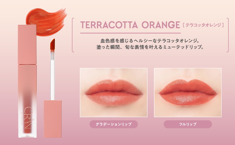 血色感を感じるヘルシーなテラコッタオレンジ。塗った瞬間、旬な表情を叶えるミューテッドリップ。